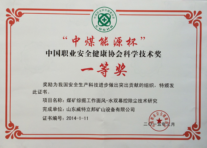 • 濟寧市首屆創新大賽“煤礦采掘面濕噴除塵系統設備”創新組二等獎